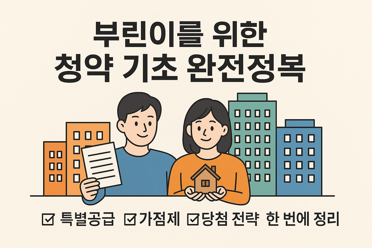 특별공급, 가점제, 당첨 전략까지 한 번에 정리“청약이 뭐야?”, “주택청약통장만 들면 되는 거 아니야?”처음 부동산을 접하는 ‘부린이’들에게 청약 제도는 복잡하고 어렵게 느껴질 수 있습니다. 하지만 내 집 마련을 꿈꾸는 사람이라면 꼭 알아야 할 첫 관문이 바로 ‘청약’입니다. 이 글에서는 부동산 초보도 쉽게 이해할 수 있도록 청약의 기본 개념부터 특별공급, 가점제, 당첨 전략까지 친절하게 정리해 드릴게요. 💡 1. 청약이란 무엇인가요?청약은 새로 짓는 아파트나 분양주택에 대해 “이 집을 사겠다”는 의사 표현을 등록하는 절차입니다.공공 또는 민간이 짓는 아파트에 입주할 수 있는 권리를 얻기 위한 경쟁의 시작이라고 볼 수 있어요.왜 청약을 해야 할까요?• 시세보다 저렴하게 새 아파트에 들어갈 기회•..